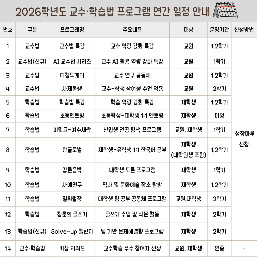 2026학년도 교수·학습법 프로그램을 아래와 같이 운영하오니, 교원 및 학생들의 많은 참여 부탁드립니다.