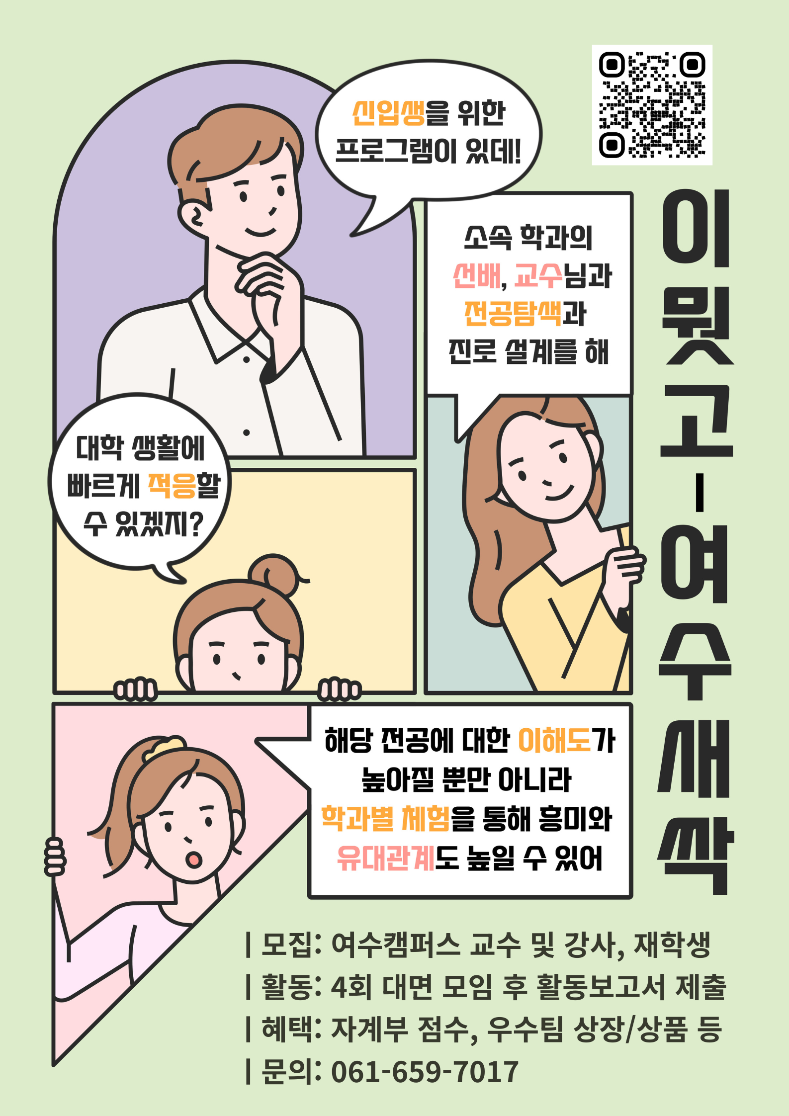 여수캠퍼스 신입생의 안정적인 대학 생활 정착 지원과 전공 이해 및 탐색을 통한 자기주도역량 강화를 위해 2026학년도 1학기 [이뭣고-여수새싹]을 운영하니, 교원 및 학생분들의 많은 참여 바랍니다.
